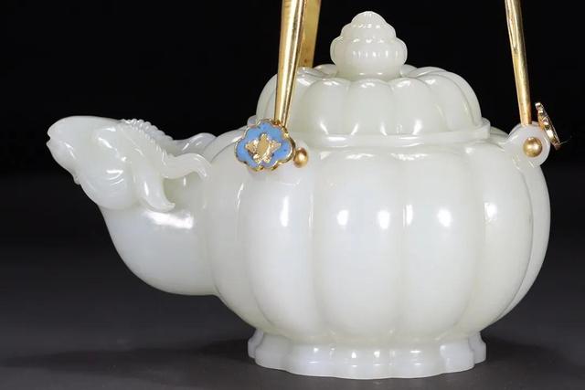 海外回流 清代宫廷风格和田玉三系耳瓜棱提梁壶 尺寸:高24**18**11.5厘米、重958.8克!