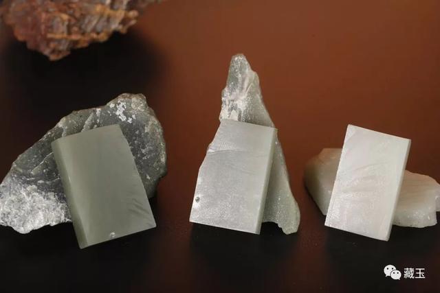 这三块料可以大概代表于田青玉、青白玉的不同青色。