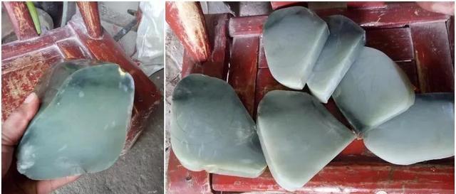先切一块籽料带翠的原石,大家感受一下......